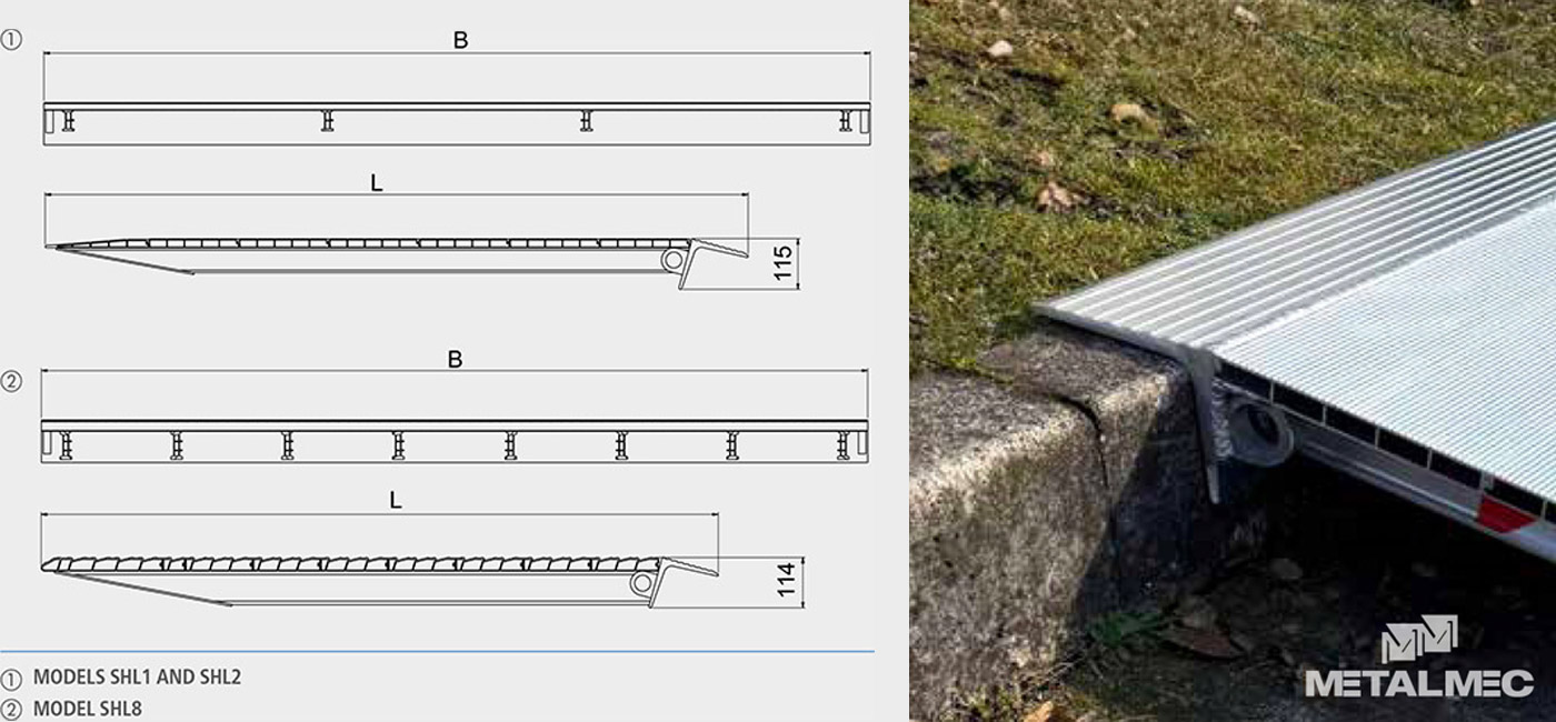 The SHL range, made in length 1.5mt and width 2.2mt, has been specially designed to allow the overcoming of height differences from 100 to 300mm, such as containers, guaranteeing the maximum safety of transit of vehicles thanks to its width. The SHL1 and SHL2 models are characterized by a special non-slip surface, certified R13, and are suitable for loading manual trucks, manual and electric pallet trucks.